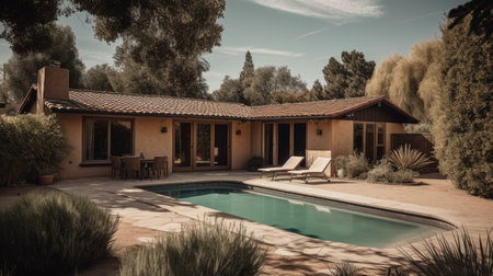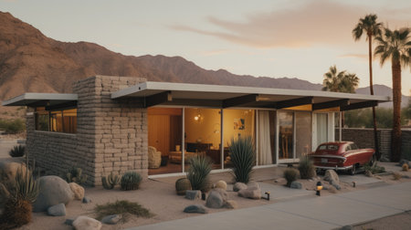 Home architecture design in Mid-Century Style with Large windows constructed by Wood and glass material. Post-war architecture with modern elements. Generative AI AIG25 .