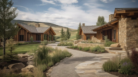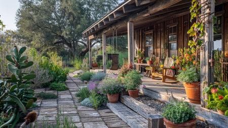 Rustic setting with farmhouse elements, such as a garden with native plants and wood decor. generative ai