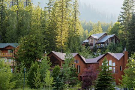 Wooden houses in the forest. View from above. Beautiful landscape.