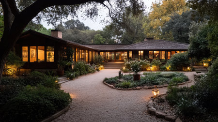 This stunning image captures a modern home immersed in lush gardens, warmly lit at dusk, creating a tranquil and inviting atmosphere for relaxation and aesthetic enjoyment.
