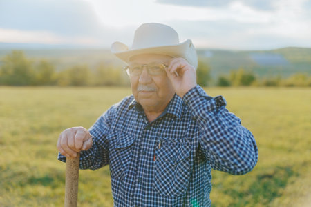 Confident Senior Farmer In Cowboy Hat At Sunset, Rural Lifestyle, Agriculture, Countryside.