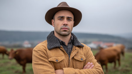 The image features a confident farmer standing in a picturesque rural field, surrounded by grazing cows on a cloudy day. His calm expression and casual attire embody the farming lifestyle.