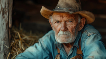 Farm man wearing a straw hat in a barn