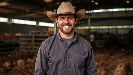 A man smiles while standing in a barn filled with livestock. The setting is bright and organized, showing the daily life of farming and animal care.