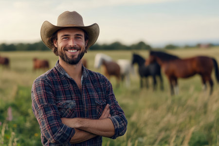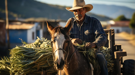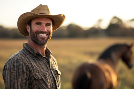 A farmer stands proudly next to his horse in a vibrant sunflower field. The warm light of evening casts a beautiful glow, highlighting the farmers joyful expression and rustic attire.