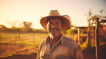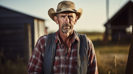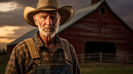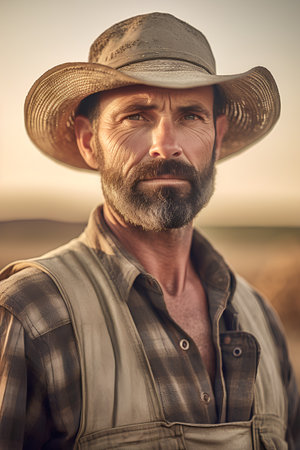 Rugged farmer wearing a hat and overalls standing in a field at sunset, exuding experience and determination
