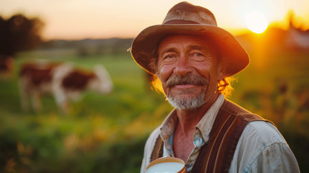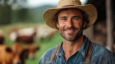 Smiling farmer in overalls and straw hat, standing in a green field with cows