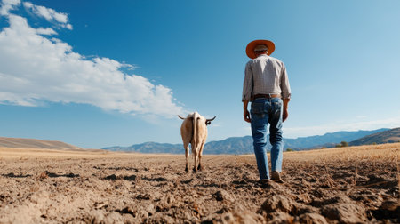 A farmer in a hat and jeans walks alongside his goat on parched, cracked earth, symbolizing resilience in harsh conditions.
