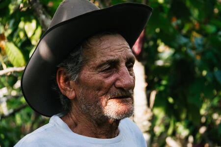 glad Latin American farmer with cap looking at the camera cheerfully and smiling at sundown. Portrait of the successful senior farmer with moustached smiling at camera