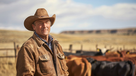 Side profile of a thoughtful rancher, surrounded by cattle and open landscape under bright blue skies.