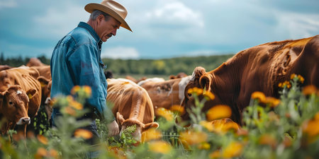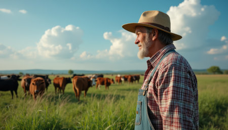 A farmer in a cowboy hat admires open fields filled with grazing cattle under a beautiful sky, showcasing the essence of rural life and the vital role of agriculture in our society