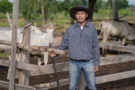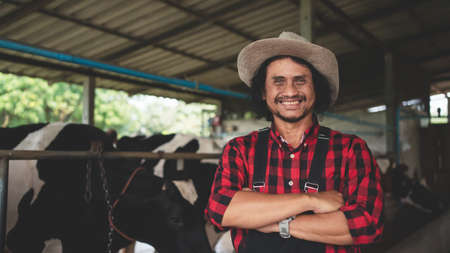Positive male farmer in a hat on a background of cows with copyspace. High quality photo