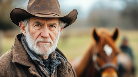 Wrinkled Face, Wise Eyes. Senior Farmer Surveys His Land as Horses Graze at Golden Hour.