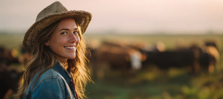 Smiling Farmer Woman with Cattle at Sunrise in Serene Countryside