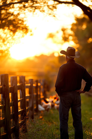 Golden Hour on the Ranch A weathered Cowboy Contemplates the Setting Sun over his Pasture