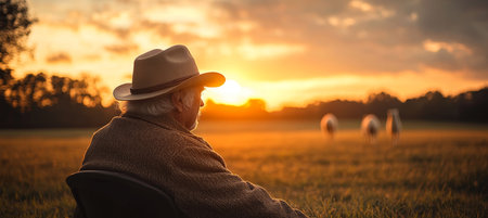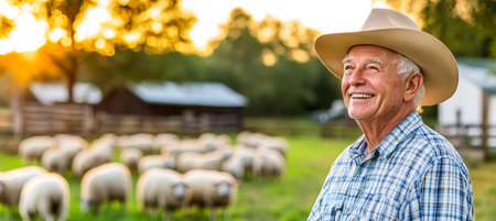 Happy Senior Cowboy at Sunset, Proudly Watching Over His Flock of Sheep in the Pasture