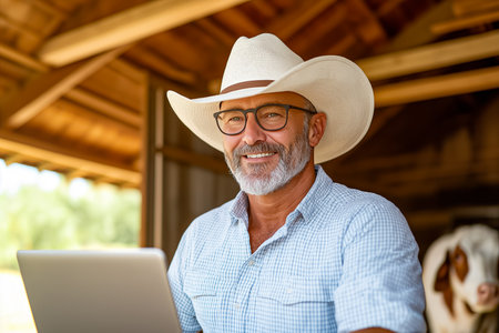 A farmer with a gray beard and glasses happily works on a laptop inside a barn, embodying the blend of traditional farming and modern technology.