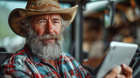 In a tractor on a sunny day, a mature farmer is using a tablet computer