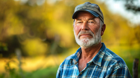 Portrait of a bearded male farmer with arms crossed, wearing a hat, in a rural setting