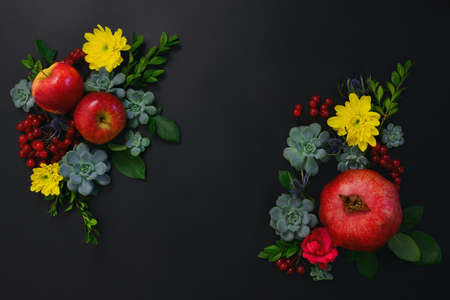 Autumn floral pattern of fruits and berries on a dark background. Top view