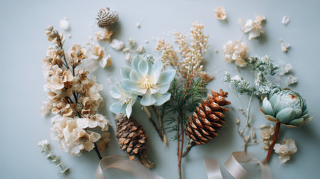 Discover the beauty of nature with this elegant floral arrangement featuring succulents and pine cones on a soft blue background, perfect for d