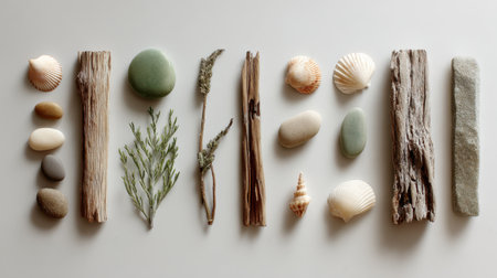 A serene collection of driftwood, shells, and stones, beautifully arranged against a soft backdrop, perfect for design projects and nature-inspired art.