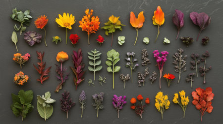 Explore a vibrant collection of fresh flowers and leaves arranged beautifully on a dark surface, perfect for inspiring natural decor and botanical art projects.