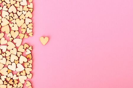 Copy space with wooden hearts on pastel pink background. Holiday banner, web poster, flyer, greeting card, cover. Romantic background