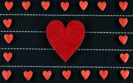 A row of red hearts from felt. Background for congratulations on Valentine's Day. Background for sale. Black lettering paper.