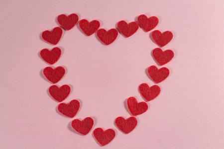 Red paper hearts on a pale pink background. Minimal concept.