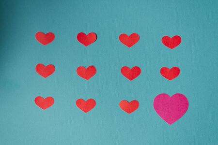Gray wooden hearts arranged on a pastel turquoise background with one red heart. Authentic, romantic love minimal flat lay