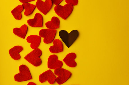 Lots of red fleece hearts and one brown heart made of cardboard on a yellow background with a copy space.