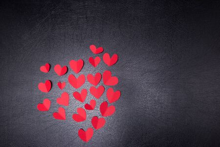 A lot of small hearts of red color against on a black background. Happy Valentines Day.