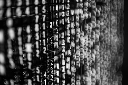 This black and white image features a close-up of a vintage display board, showcasing numbers and letters. The abstract composition emphasizes mechanical details, creating a nostalgic feel.
