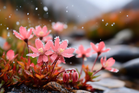 Pink flowers blooming in the rain, covered with frost crystals, create a delicate and beautiful scene