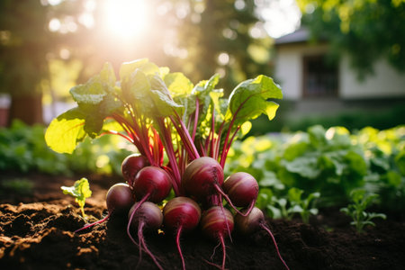 bed with growing red beets, sunlight, harvest