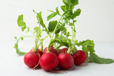 Freshly harvested red radish features lush green leaves, resting on a clean white surface. This natural produce is ideal for healthy cooking and vibrant salads.