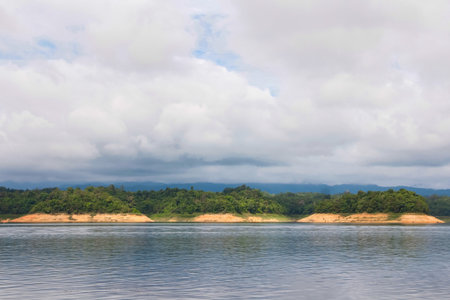 Beautiful view,The Islands and mountains on lake in dam. On the day of clouds and cloud reflection in the beautiful reservior of KaengKrachan National Park,Thailand.