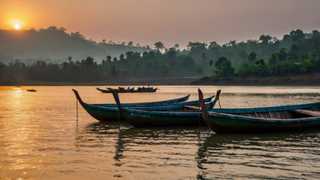 Fishing boats on the bank of the river at sunrise, Sri Lanka