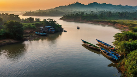Country Landscape. A picturesque River in the middle of village and forest. Bangladeshi natural view. Rural area. Khagrachari, Bangladesh.