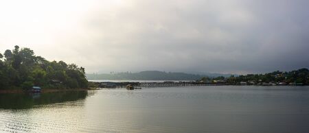 Panoramic traditional house and wooden bridge over the river (Mon Bridge) in Sangkhlaburi District, Kanchanaburi, Thailand.