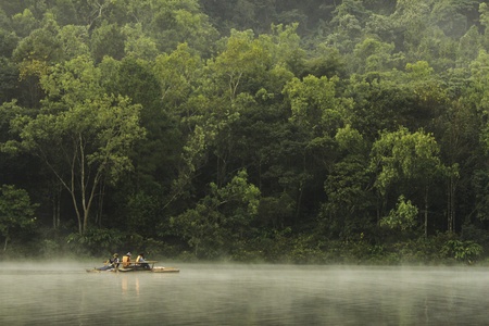 Landscape of tropical rainforest and lake river, haze cover green area in morning after moisture touching heat of sunlight, Khao Yai national park, Thailand.