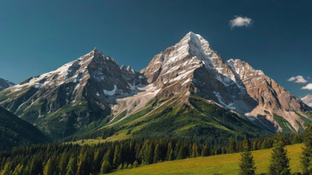 Sunlit mountain peak with snow and forest under a clear sky