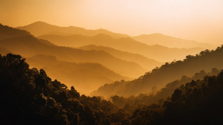 Breathtaking panoramic view of a misty mountainous landscape with a serene atmospheric valley and hazy peaks in the distance This stunning natural scenery evokes a sense of tranquility and adventure