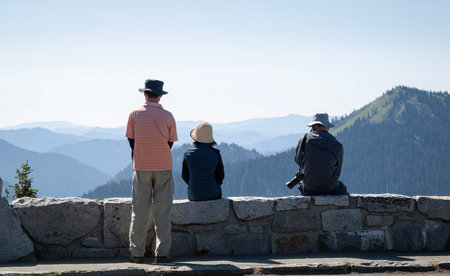 Three tourists enjoying the beautiful views at Sunrise Trail. Mount Rainier National Park. Washington State.