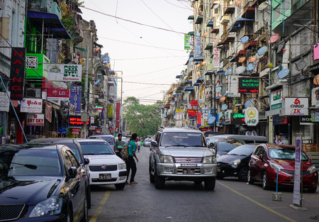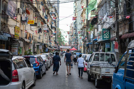 Yangon, Myanmar - Feb 13, 2017. Old street with buildings at Chinatown in Yangon, Myanmar. Yangon has the highest number of colonial period buildings in south-east Asia.