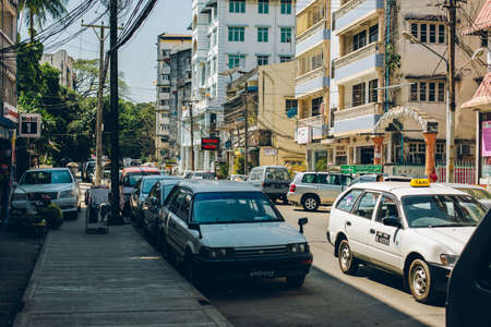 Yangon, Myanmar - FEB 19th 2014: Street view of taxi and cars on the street of Yangon, Myanmar