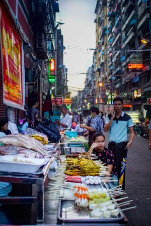 A street vendor sit next to her stall selling fresh skewers at the 19th street night market in the Chinatown district of Yangon, Myanmar