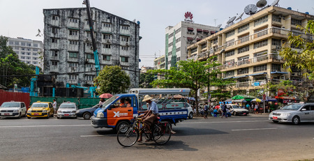 Yangon, Myanmar - Feb 26, 2016. Street of Yangon, Myanmar. For many years, motorbikes have been banned in Yangon.
