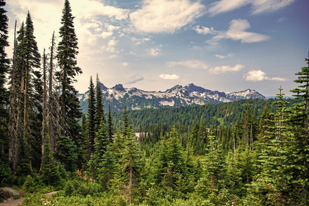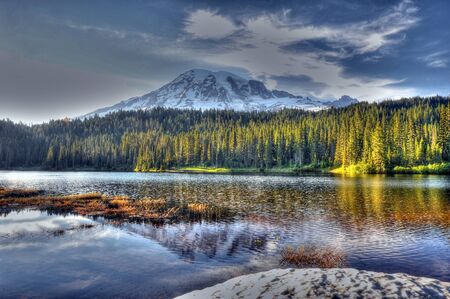 Landscape of Mount Rainier National Park, lake in Washington State, USA